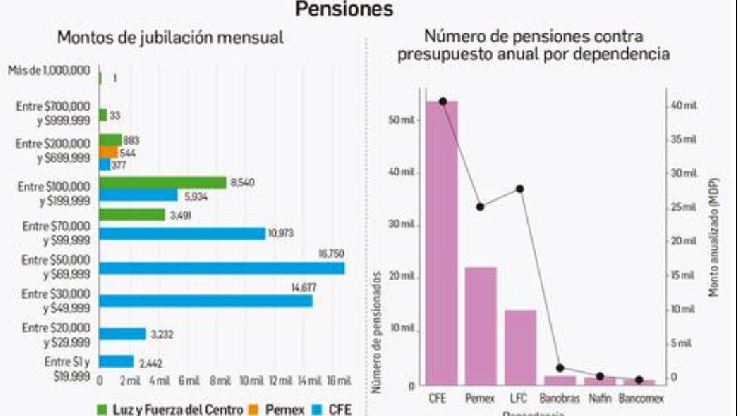 Raquel Buenrostro, titular de la Secretaría Anticorrupción y Buen Gobierno, expuso que la extinta Luz y Fuerza del Centro (LFC), Petróleos Mexicanos (Pemex), la Comisión Federal de Electricidad (CFE), Nacional Financiera (Nafin), Banobras y el Banco Nacional de Comercio Exterior (Bancomext) tienen en conjunto 94 mil 333 pensionados que reciben 96 mil 306 millones de pesos anuales, y de ellos 6 mil 297 perciben más de lo que gana la mandataria.